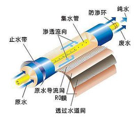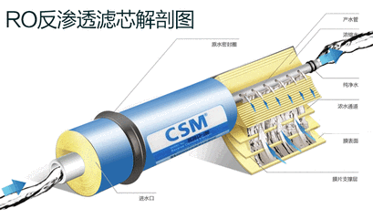 而源水中的無機鹽、重金屬離子、有機物、膠體、細菌、病毒等雜質無法通過RO膜,從而使可以透過的純水和無法透過的濃縮水嚴格區分開來,從而達到凈水的目的。下圖是RO膜的原理圖: