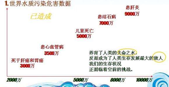 據(jù)WHO報(bào)道,世界水體中可檢查出2221種化學(xué)物質(zhì),其中飲水中有害有機(jī)污染物765種,經(jīng)鑒定確認(rèn)其中致癌物20種,可疑致癌物23種,致突變物56種,促癌劑18種。